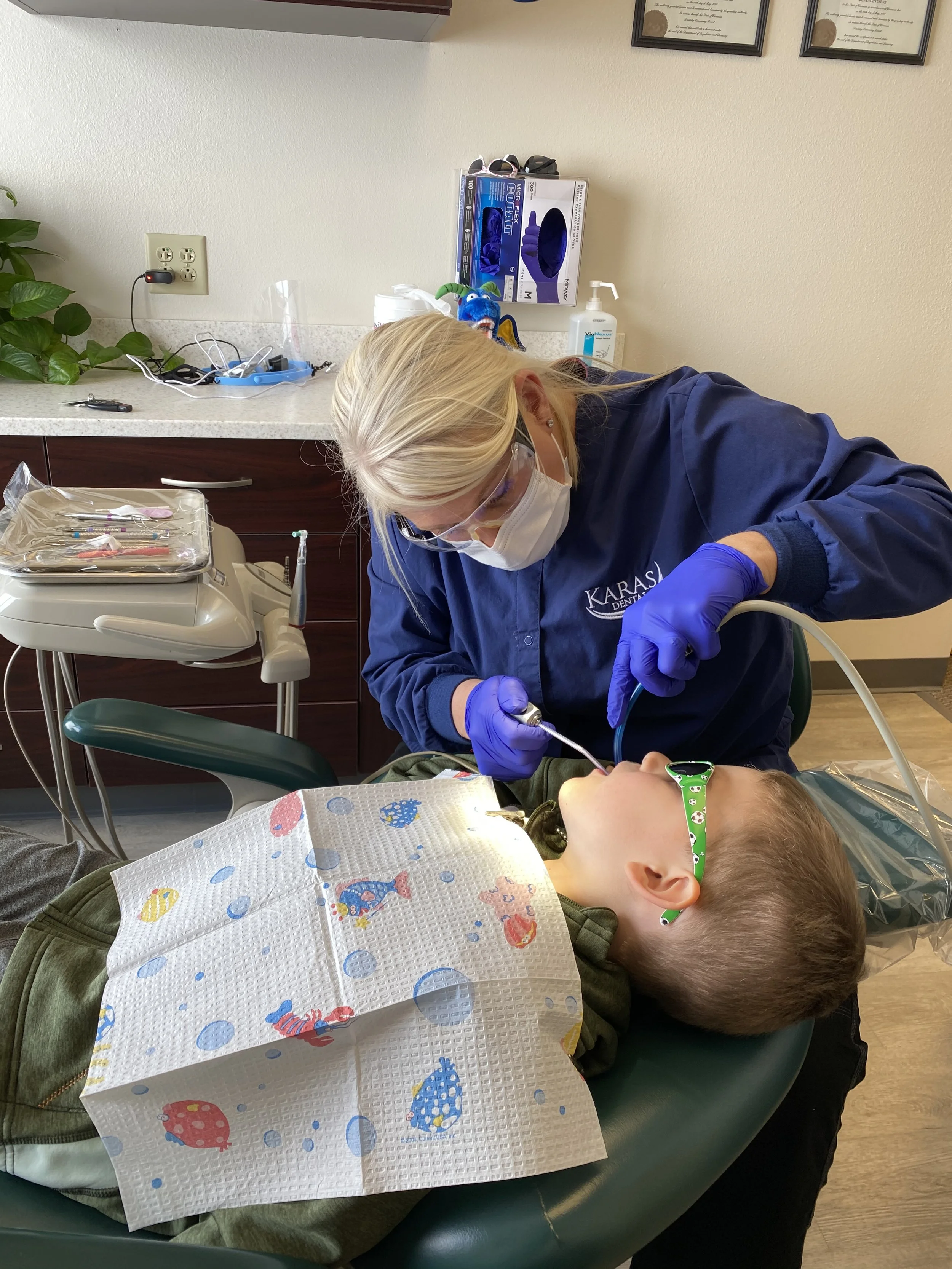 Protecting your child’s smile is a high priority for us at Karas Dental. Our team works hard to ensure that your child feels comfortable and at home when they visit us. We recommend children have their first dental appointment by the age of 3 or earlier if there is a concern. Usually, the first couple of appointments are just a ride in the chair to make the child comfortable.